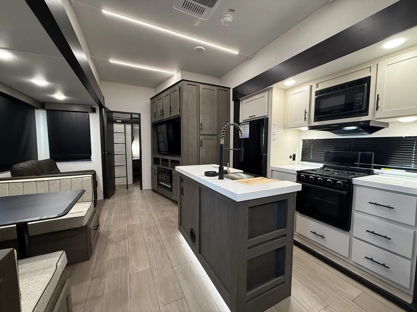 The Arctic Wolf 331BH by Forest River offers a two-bedroom design in a relatively short 38 ft 3 in form factor. In the rear is a half bathroom, 54x74 bunk, built in wardrobe storage and a 60x80 loft bunk overhead. Chef's will appreciate the island kitchen that features a 12-volt refrigerator, microwave, oven, trash can drawer, breakfast hutch and dinette that converts into a bed. Up front is a queen bed, two wardrobes and a full bathroom.