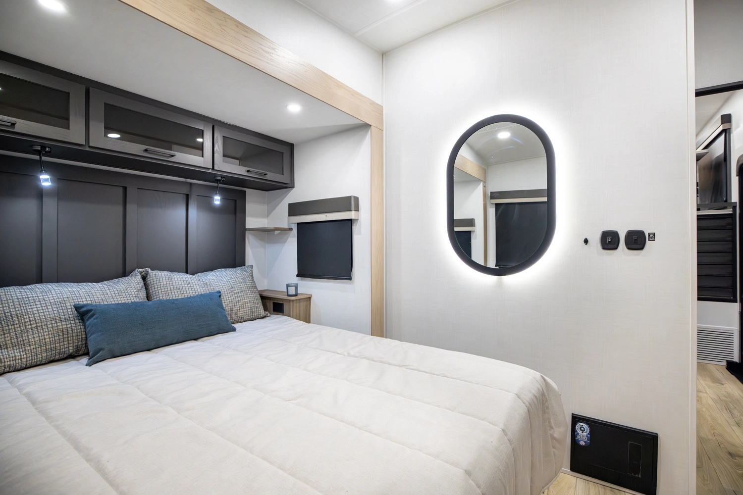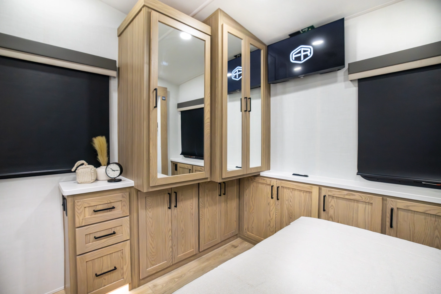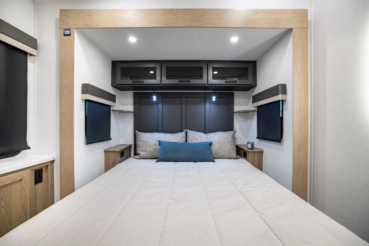 Our first front living fifth wheel under 30' delivers big luxury in a compact design! The front living area features a 60" theater seat, rotating dinette, and televator TV. The kitchen offers a full pantry, fridge, and ample counter space, while the rear bedroom includes a queen bed (king optional), wardrobe, vanity, and washer/dryer prep. With dual awnings and pass-thru storage, it’s perfect for easy towing and upscale comfort.