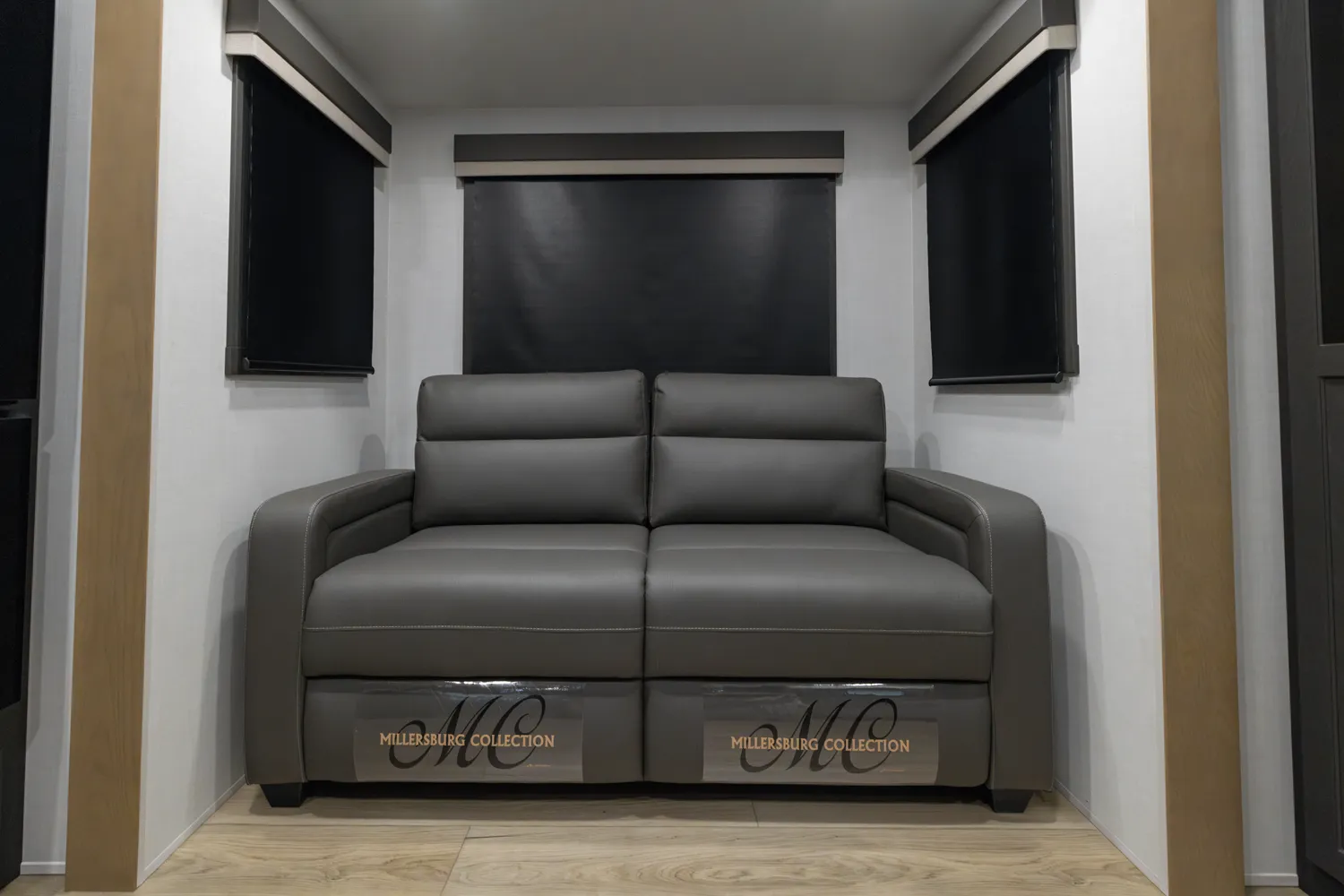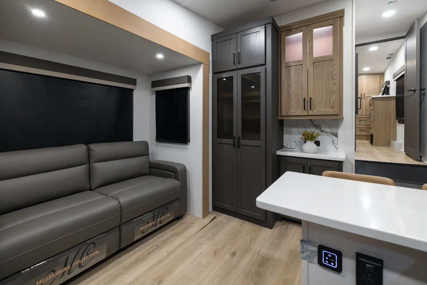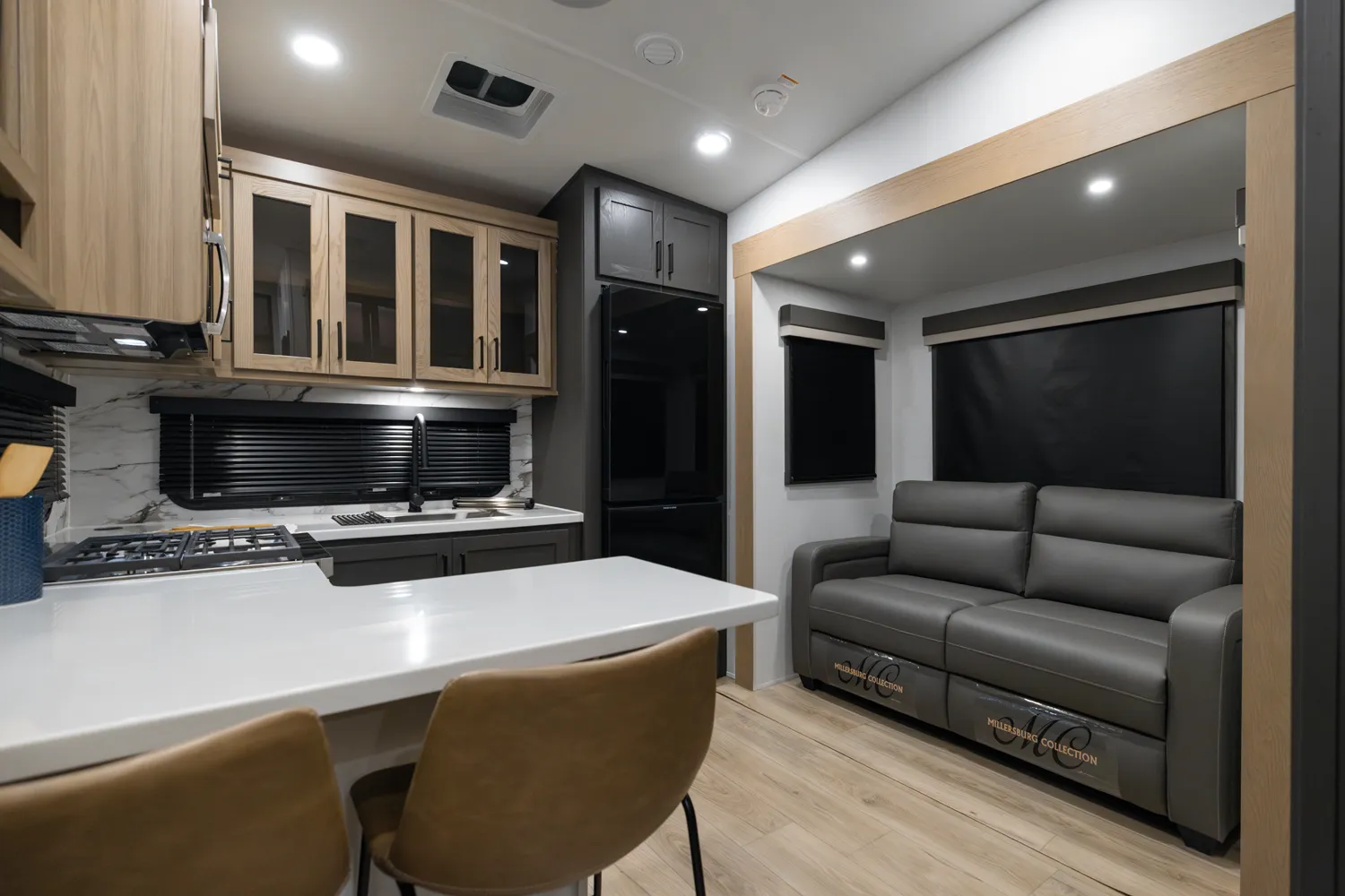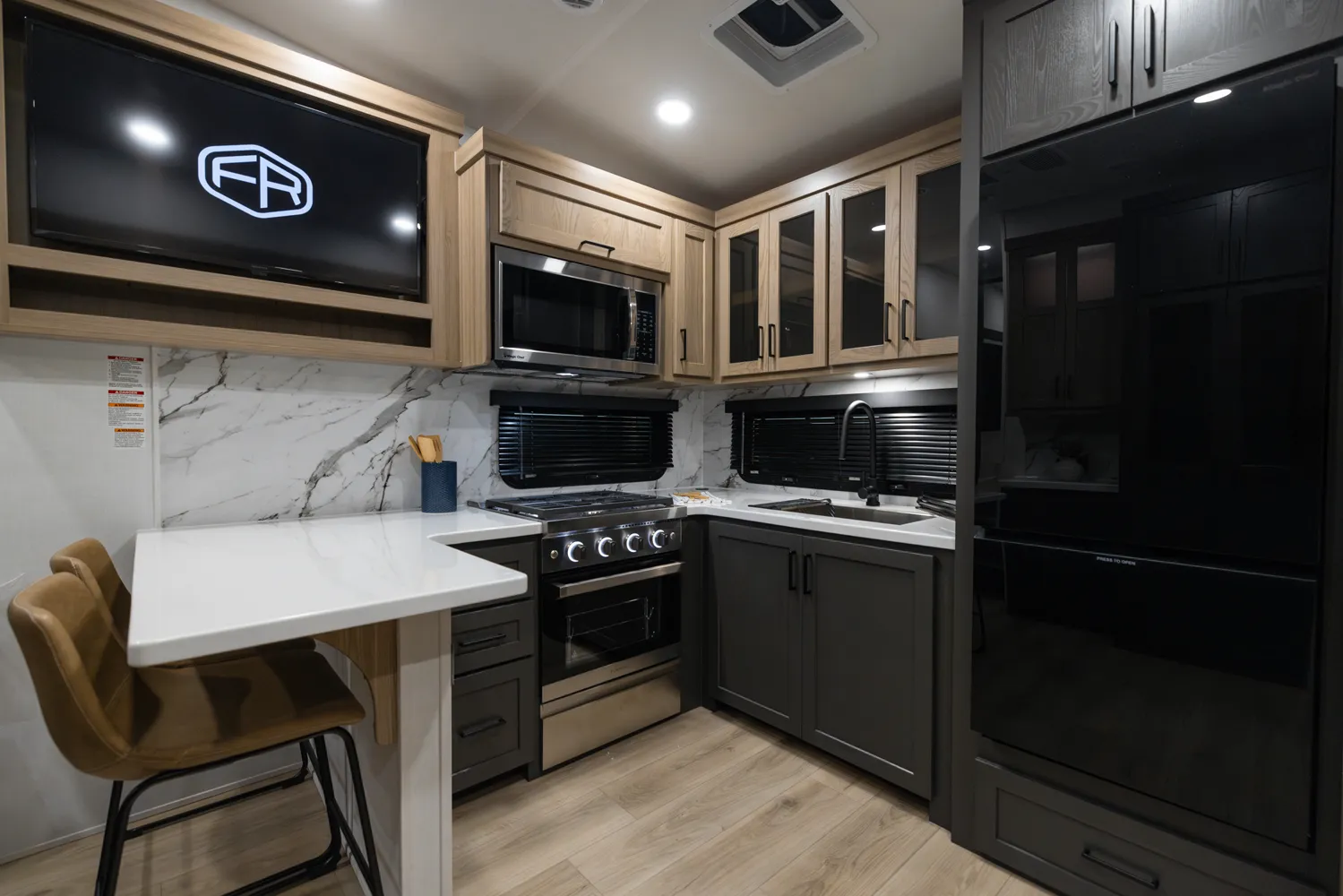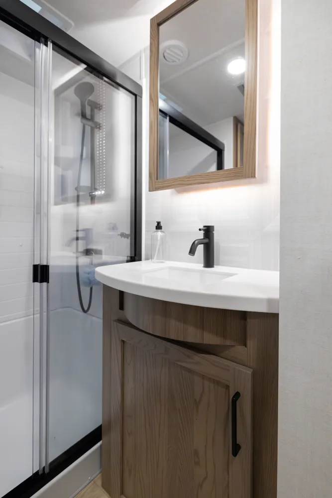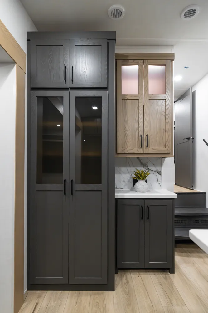 This Fifth Wheel focuses on a large bedroom and bathroom. The bathroom has a 48 x 30” shower with a seat and lots of countertop space with the vanity. The bedroom has a king bed option and storage across the front is vast and accommodating for all your needs. The living area features bar top seating for two and hide-a-bed sofa or theater seat options across from the television. This great lightweight 5th wheel couple’s coach meets so many wants and needs.