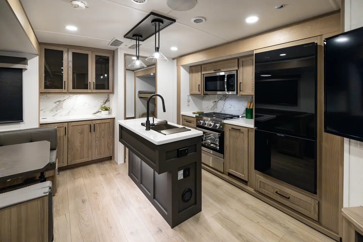 This four slide bunk model has great sleeping arrangements and a U-Dinette that can seat everyone for dinner. The outside camp kitchen has a large refrigerator and cooking stove to feed everyone you are sleeping for the trip. The bunkroom has its own entertainment and hard door for separation from the rest of the coach. The king bed option and the washer and dryer prep make this coach great on every occasion for any family.