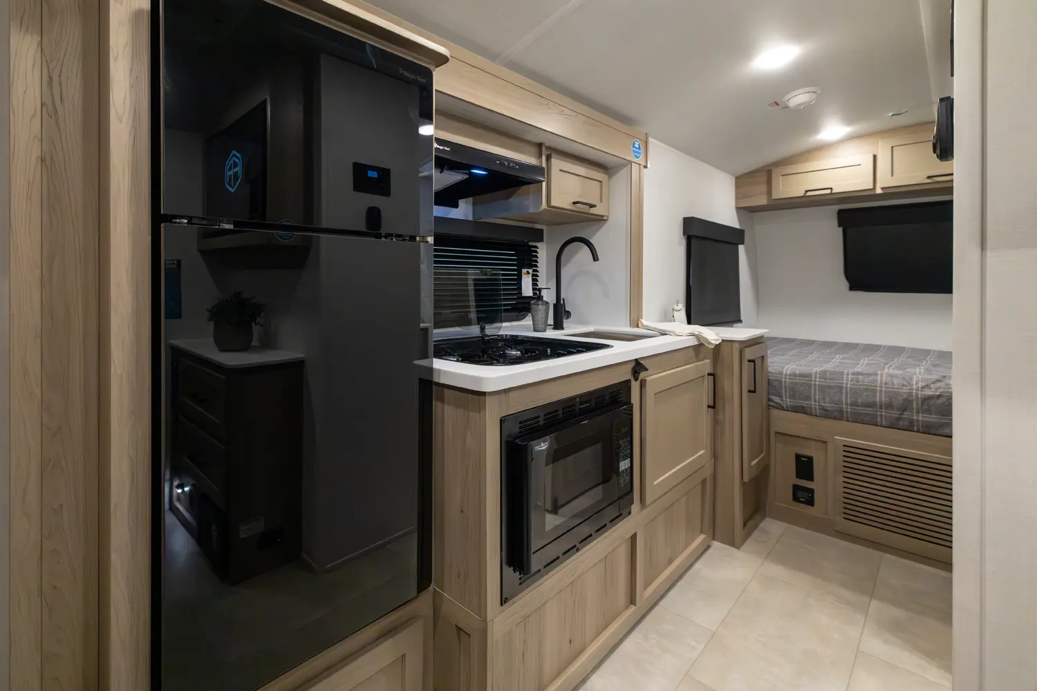 The E-Pro 19RL brings big comfort to a compact trailer. It’s the first E-Pro with theater seating, giving you a more relaxed and residential feel inside a lightweight camper. The smart rear living layout, efficient kitchen, and versatile sleeping space make it perfect for couples who want easy towing without sacrificing comfort or modern features on the road.