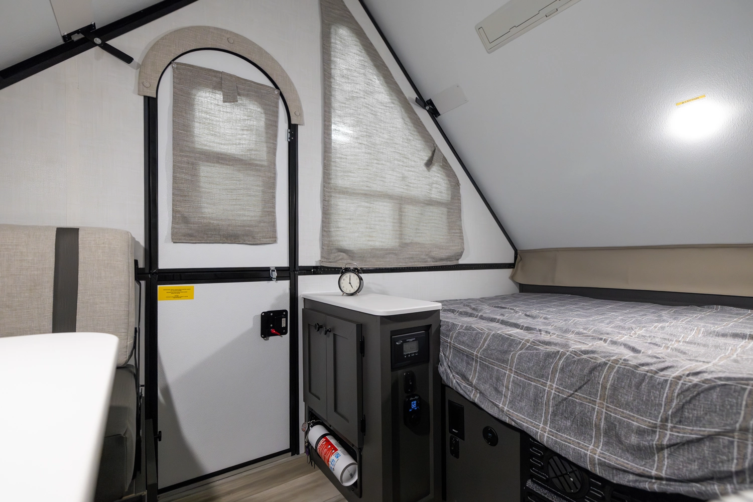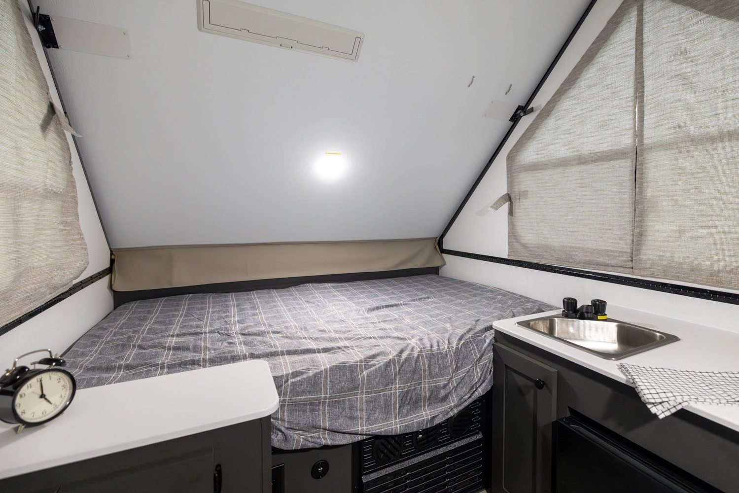 The Flagstaff T10RB is a traditional A-frame that blends simplicity with smart design. It features a front 33" x 80" dinette and a rear 54" x 80" bed that flips up for easy access. Inside, you'll have a convenient fridge, and outside, EZ-reach storage trunk and a griddle for cooking up meals wherever you go.