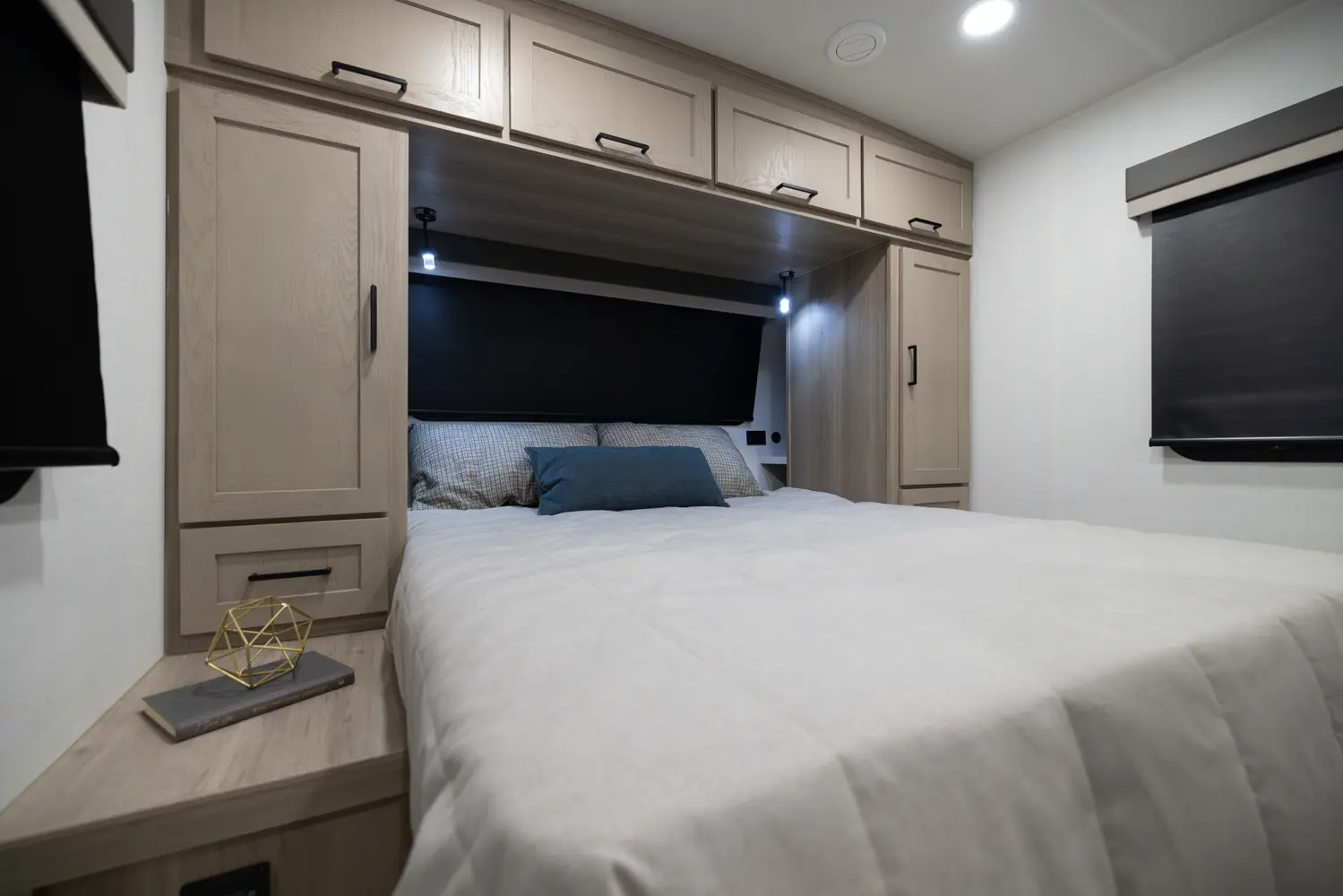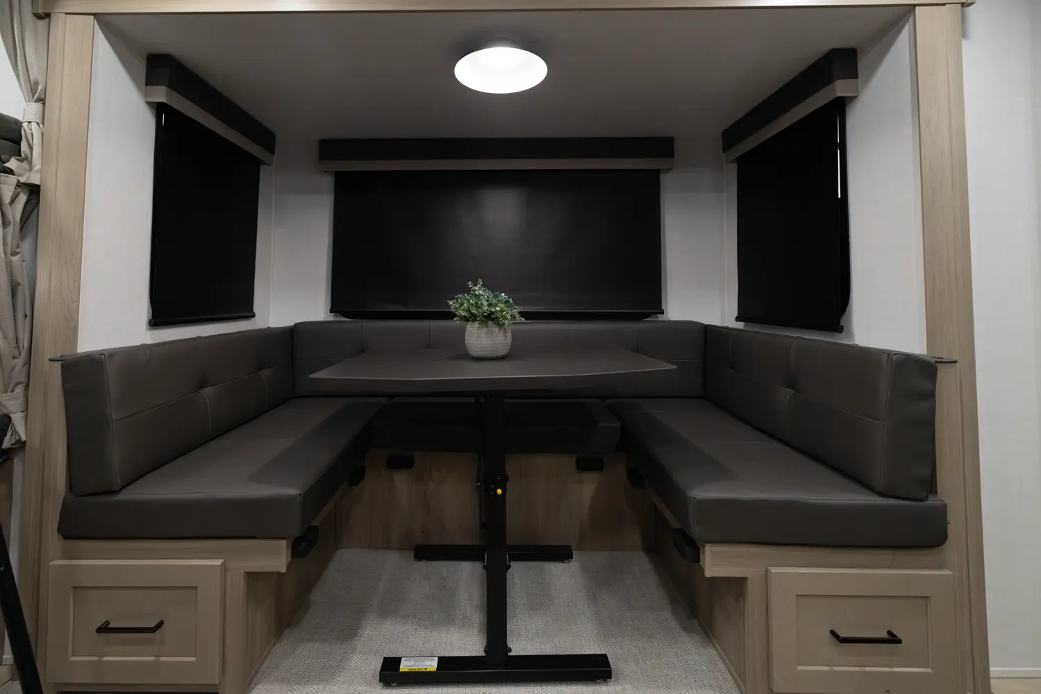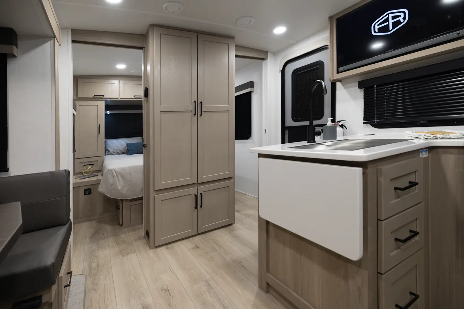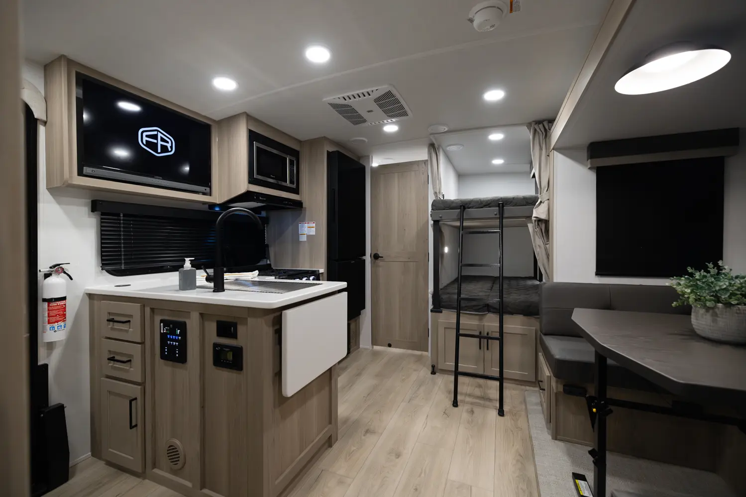 The 25DBH is a bunkhouse layout featuring a segregated front bedroom with a true queen bed and dual wardrobe closets for plenty of personal storage. In the main living area, you'll find a large U-shaped dinette, a spacious kitchen and two 36" x 71" bunks- perfect for kids or guests. This layout blends privacy, comfort, and roominess. An ideal setup for families and groups seeking versatile space on the road.