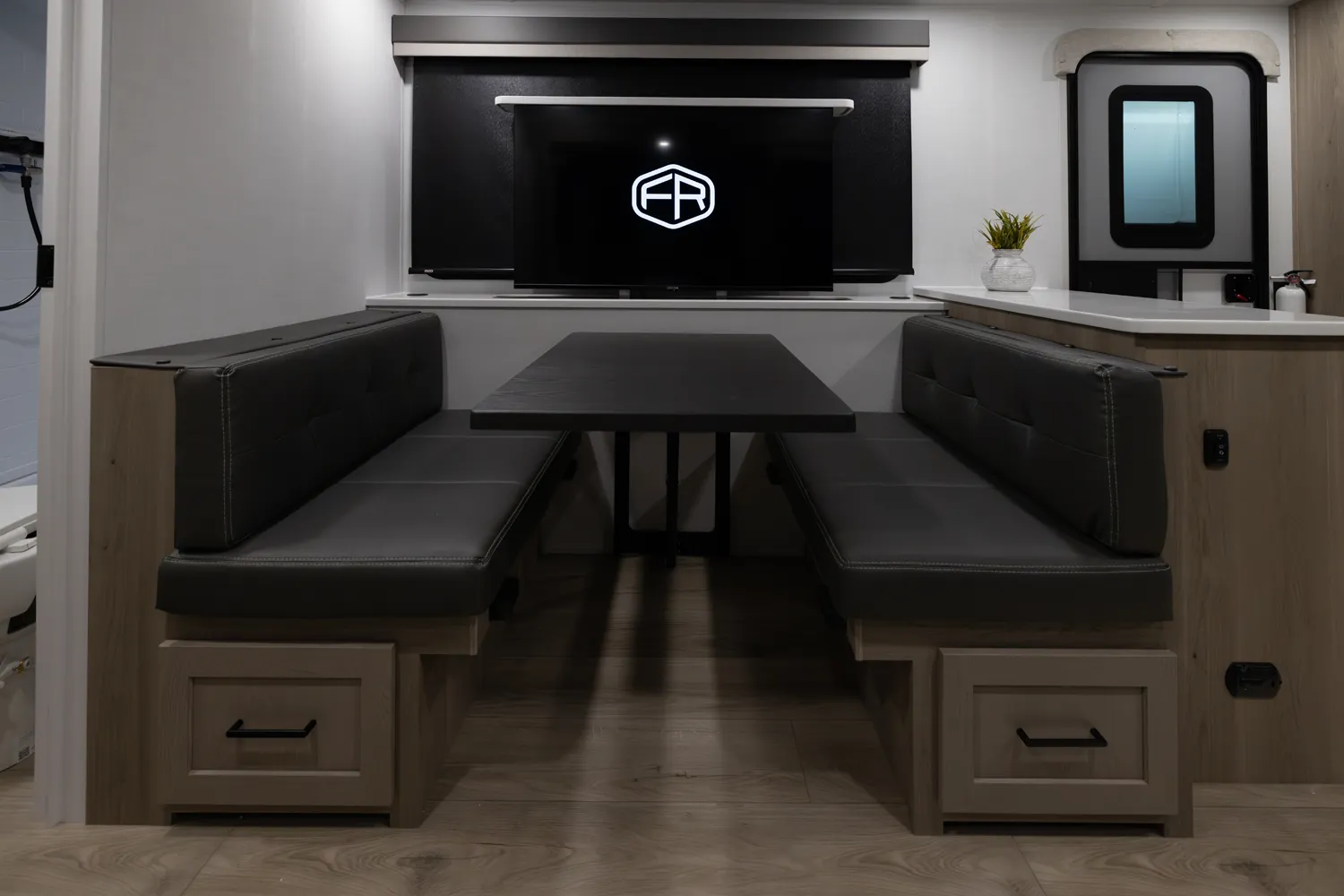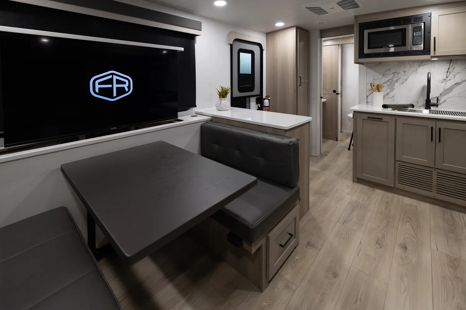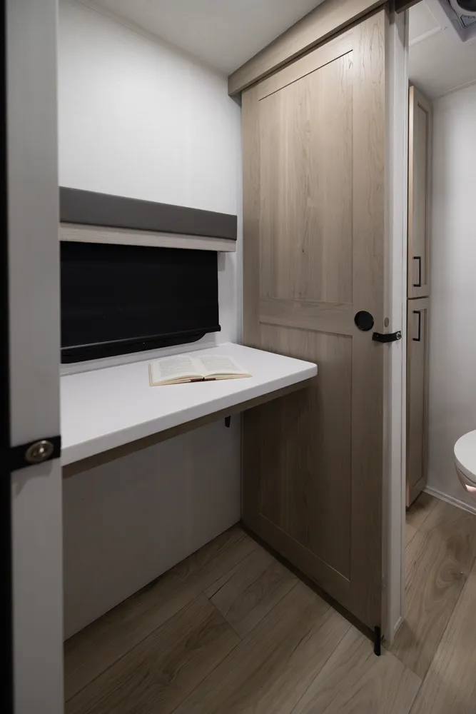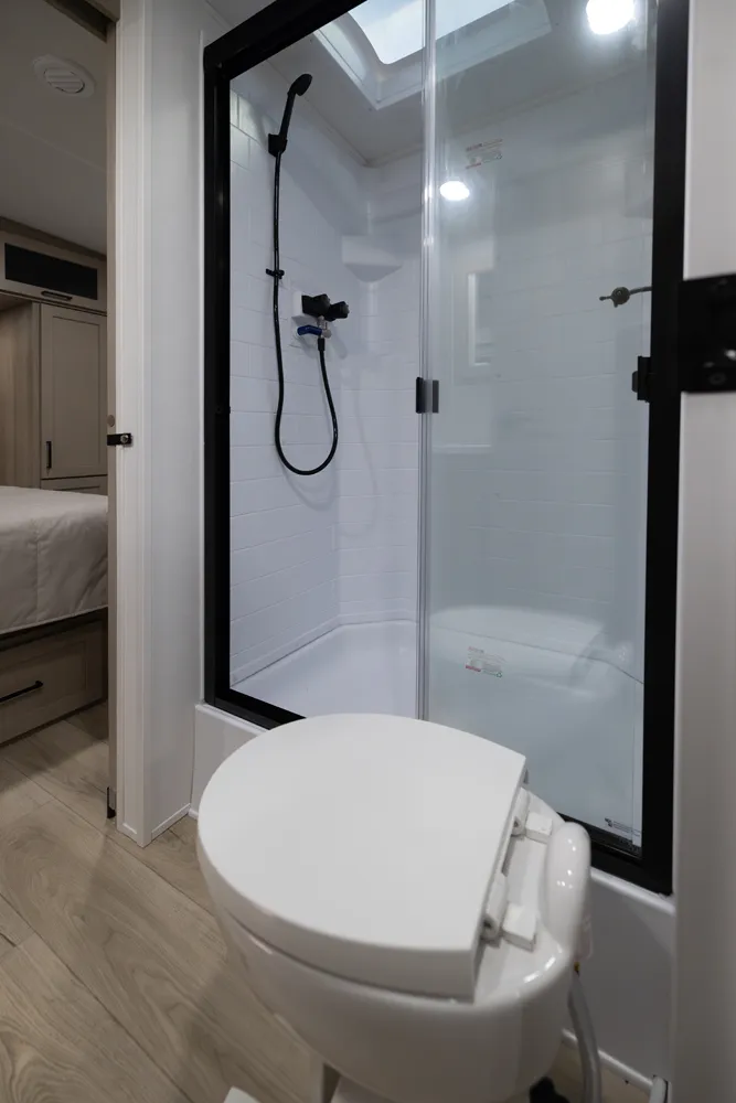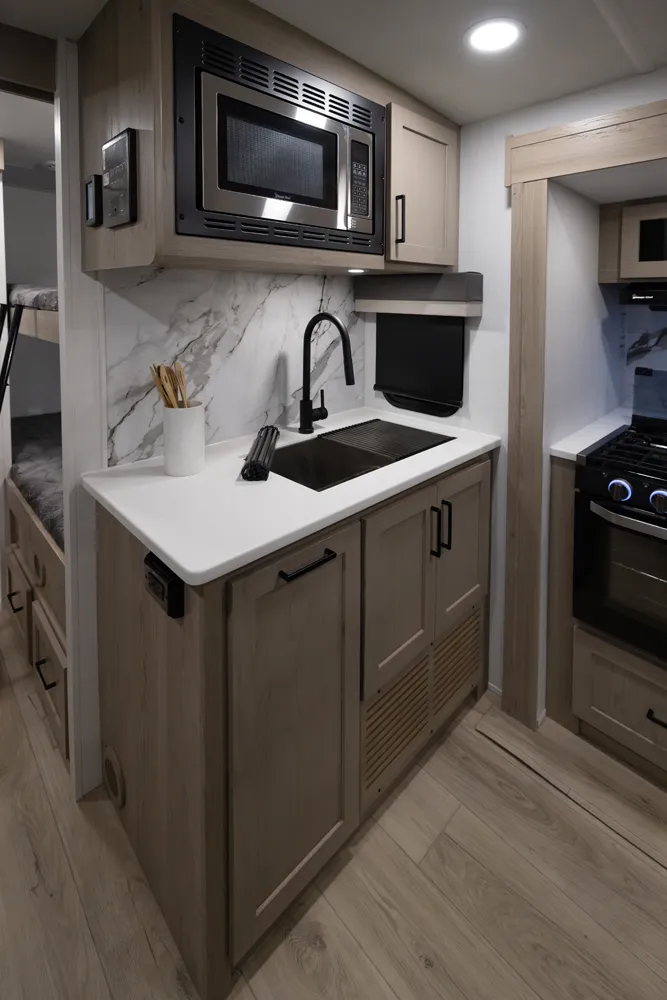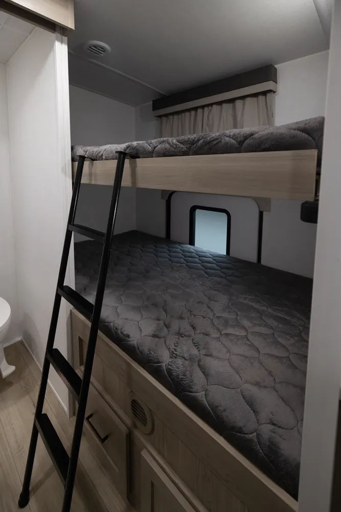 The Flagstaff 29DBH features a front bedroom with a true queen bed and a large master bathroom with shower. The spacious living area and kitchen include theater seating and a dinette for comfort and dining. A rear half-bath and segregated bunk room provide privacy and convenience, making the 29DBH ideal for families seeking versatile space and comfort on the road.