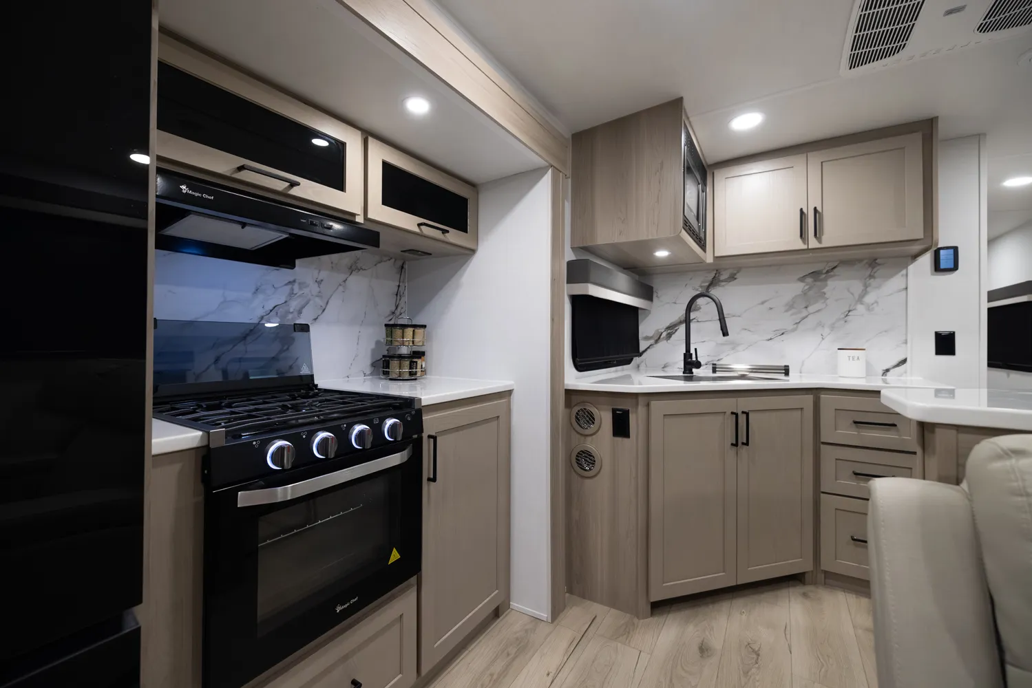 • Platinum Package: Auto Leveling, Frameless Windows, 1800W Inverter, MORryde Strut Assist Entry Step, Dual 30 LP Tanks
