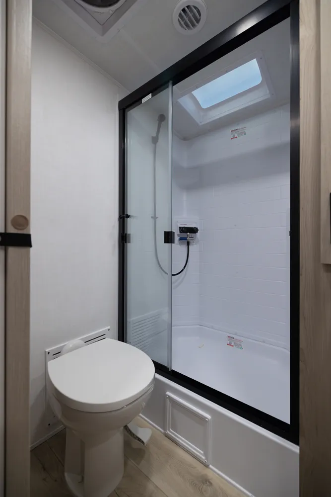 The Flagstaff 29SRL Super Lite impresses with a beautiful rear entertainment center and rear living area featuring two 60" hide-a-beds and a 60" theater seat. In the kitchen, enjoy a table with barstools and plenty of countertop space. In the bathroom, a large rectangular shower, and in the front bedroom, a true queen bed, making this Super Lite perfect for comfort, style, and family fun on the road.