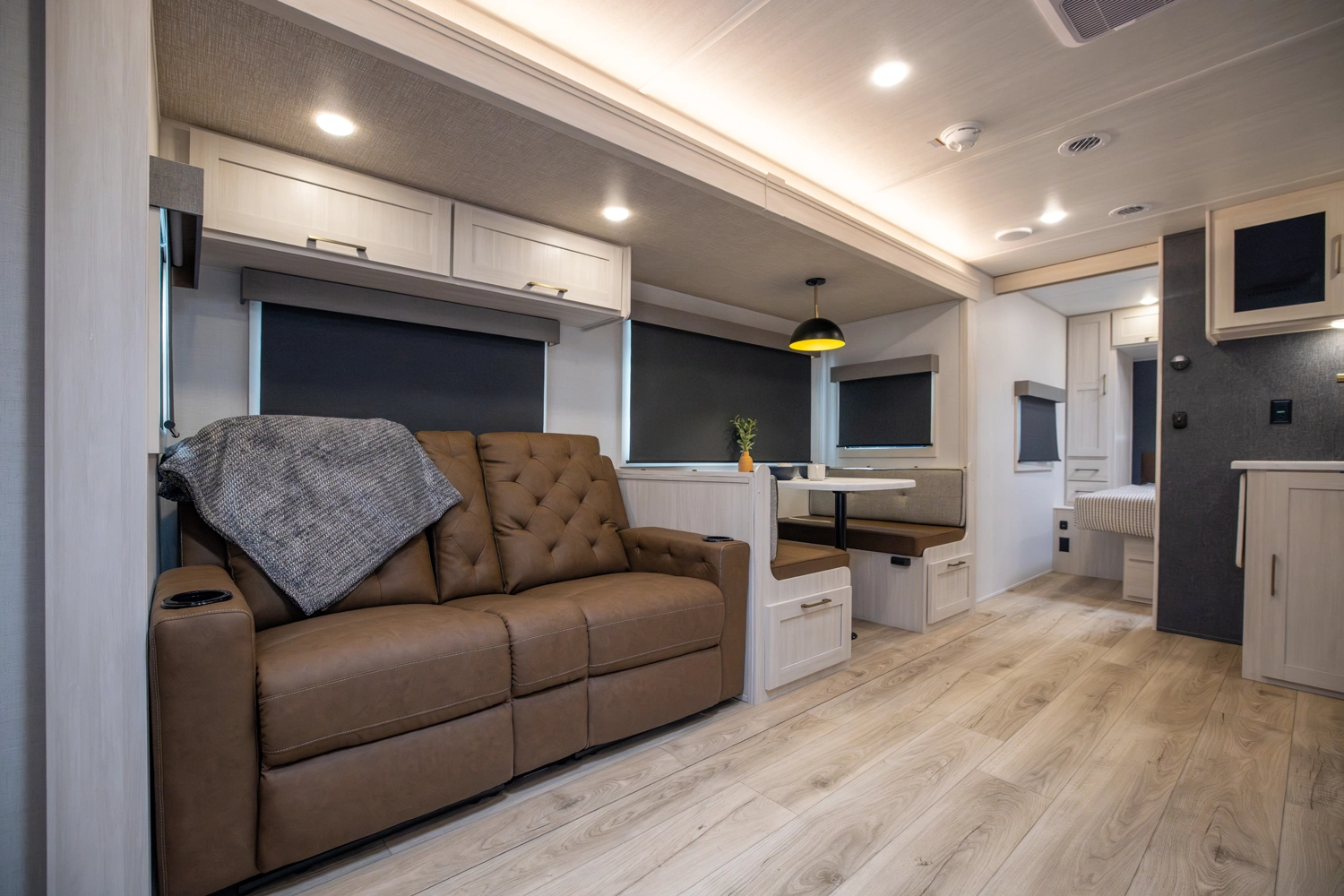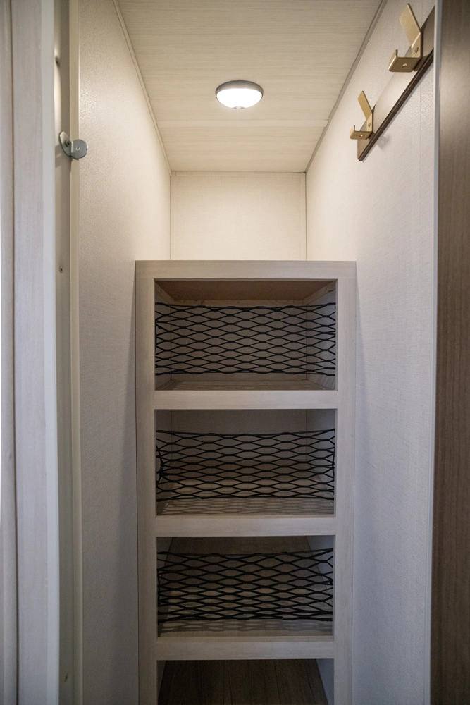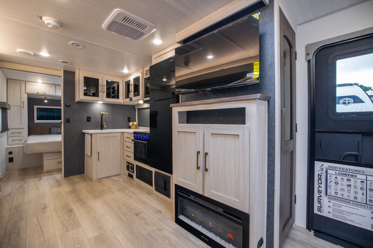 Sleeps 6. Tow vehicle 6800 lbs. minimum. No roughing it in this top selling model with walk in pantry, cook up a feast with sizable countertop space w/extension, and beautiful Barn Door concealing a big rear bathroom. Go down any road knowing you have the best in class nights rest coming in your master suite; “Cubbie” storage, large wardrobes, cavernous OH, drawers, USB’s, massive under bed storage. To top it off we added an outside kitchen!