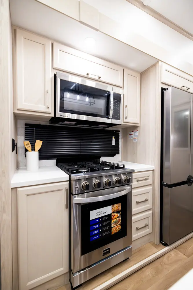 • Stainless Steel Residential Style Appliance Package w/18 Cu Ft 12V Refer and Large Range