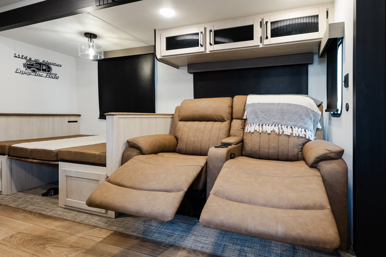 This bunk house travel trailer supplies you a great deal of space in the front bedroom. With a slide out and a large closet for all of your clothes, it will feel like your bedroom at home. The bunk house in the rear provides space for all guests to be comfortable and to make things a cut above, this floor plan provides two bathrooms. Furthermore, the exterior mini camp kitchen features a fridge and a griddle for those of you who like to cook in nature.