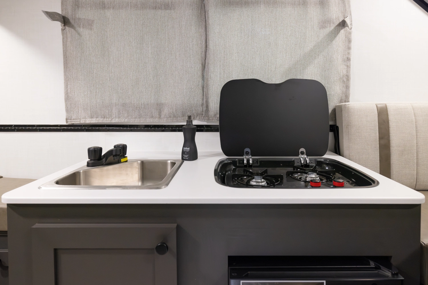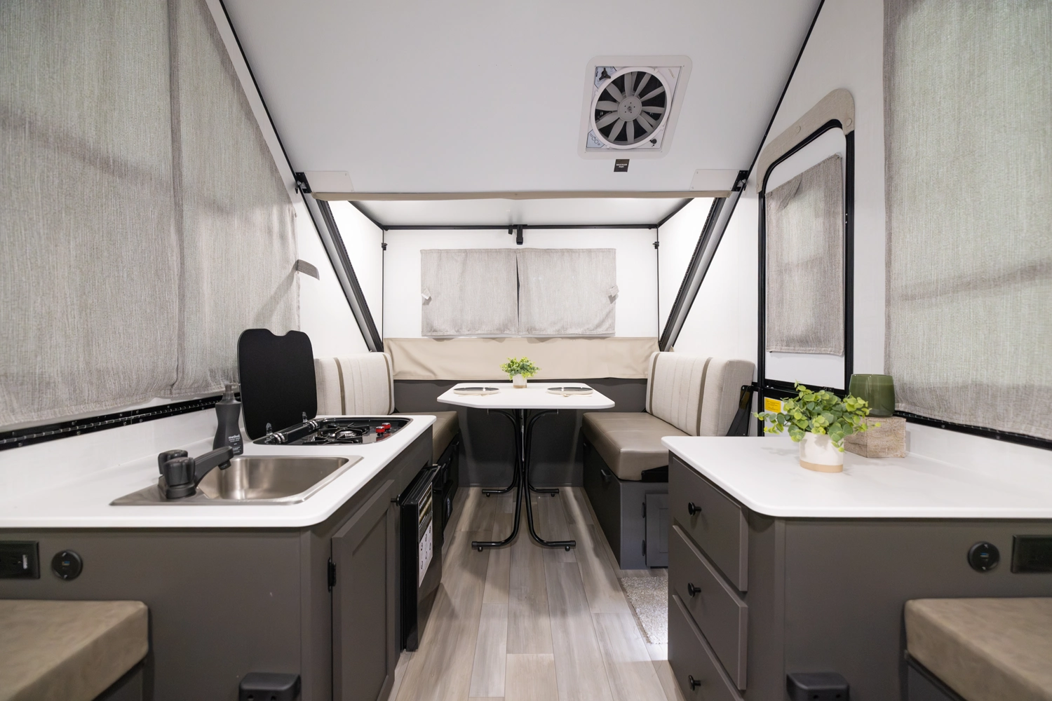 The Rockwood A121FD is a thoughtfully designed A-frame camper that maximizes space. It features a front 45" x 80" dinette, perfect for dining and relaxing. In the living area, you'll find a sink, cooktop, and small refrigerator. At the rear, a spacious 54" x 80" gaucho bed awaits, and with a double dormer, you get increased head height on both sides for extra comfort.