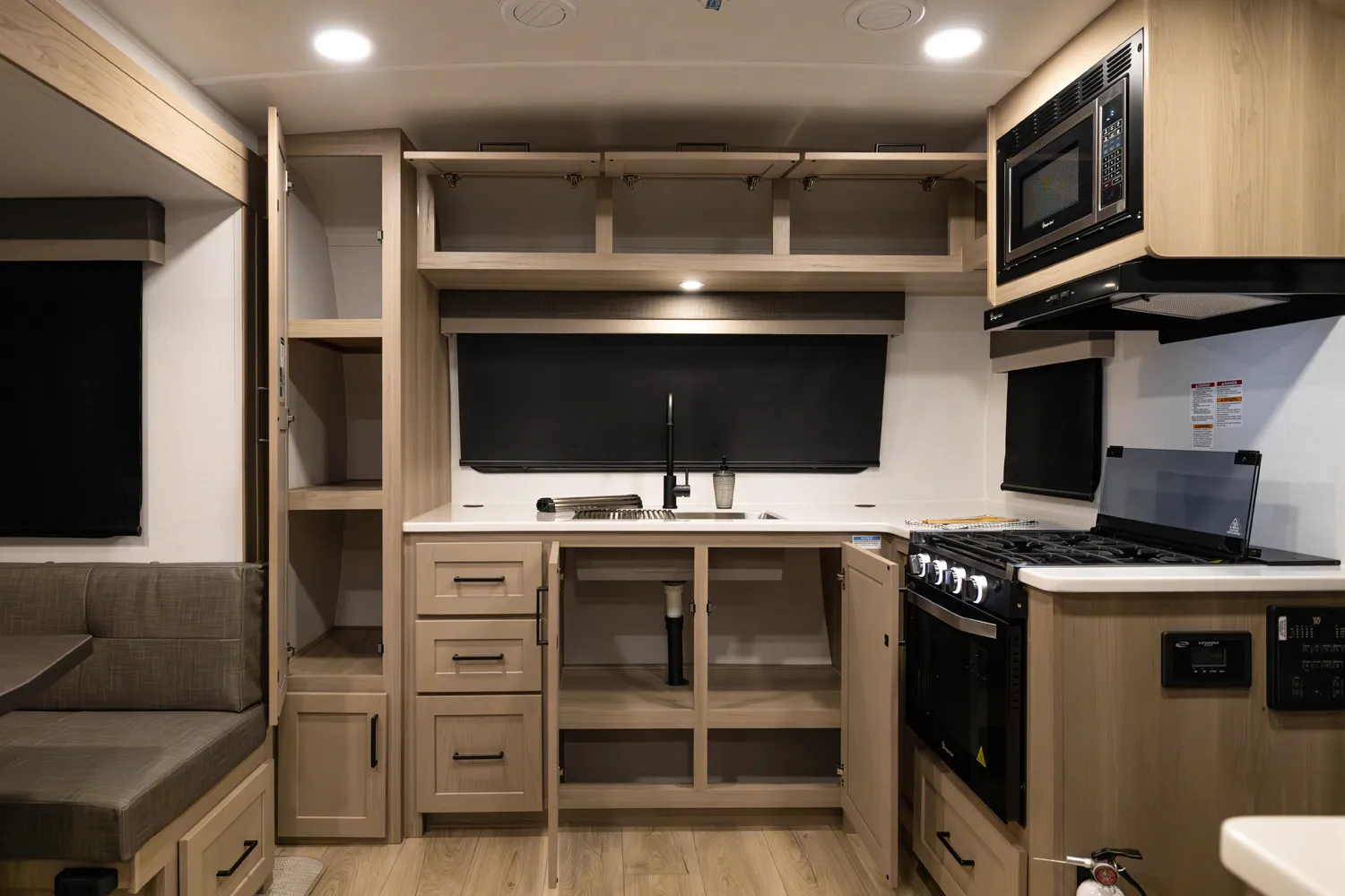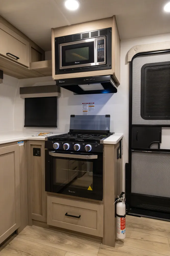 The 2506FK blends spacious comfort with smart design for a great value. The front kitchen offers abundant counter space and storage, perfect for meal prep and entertaining. The U-shaped dinette provides a roomy dining area that can convert to extra sleeping space. (optional Hide-a-Bed or Theater seating) The pass-through bathroom comes equipped with a large rectangular shower, and the rear bedroom gives you a private retreat on the road.