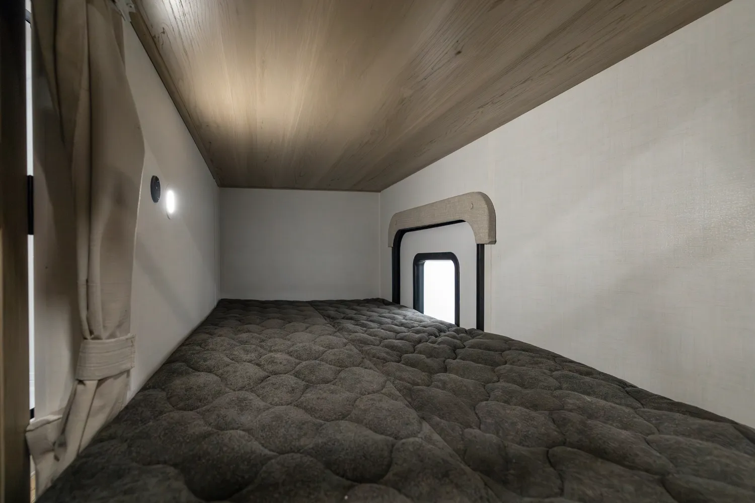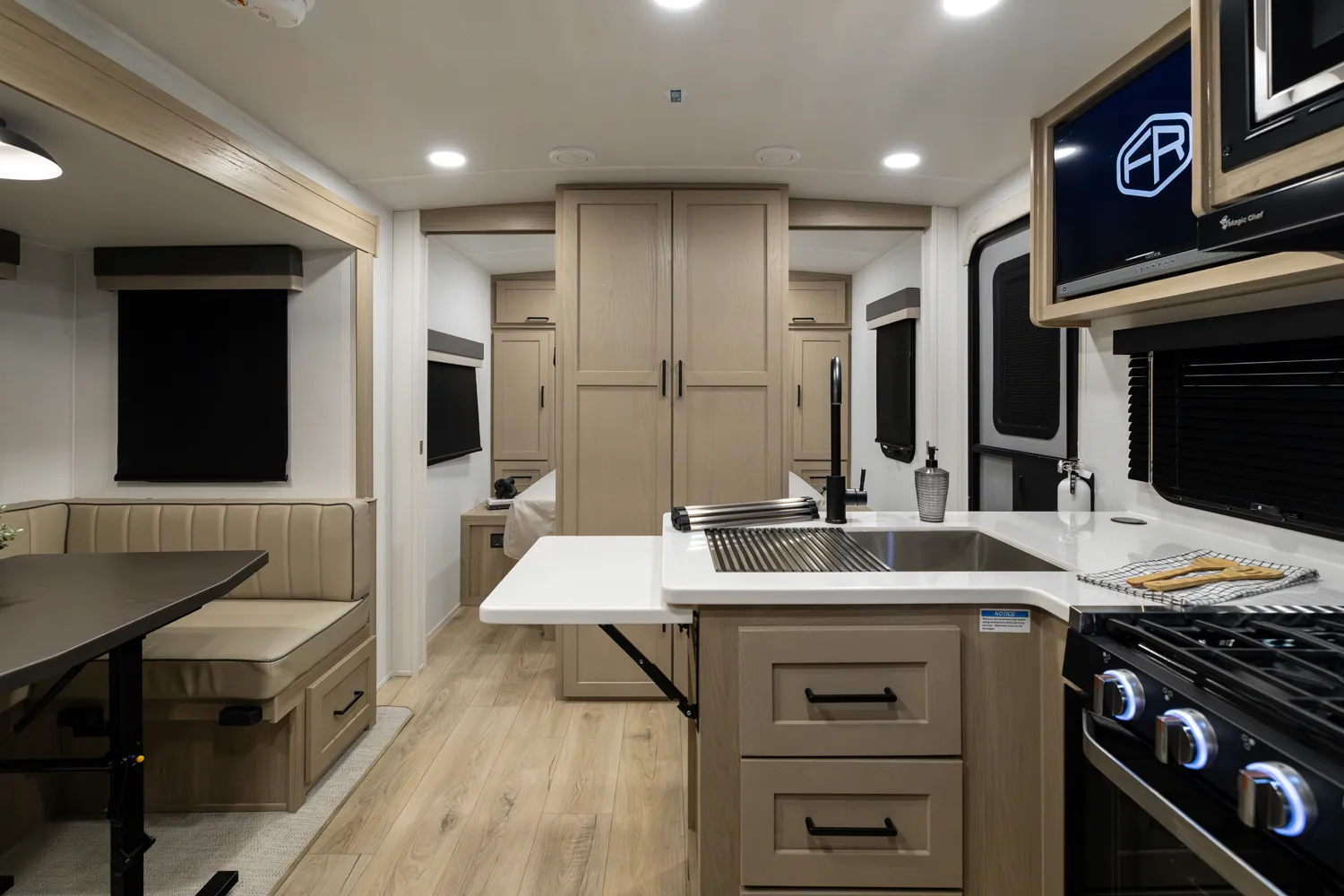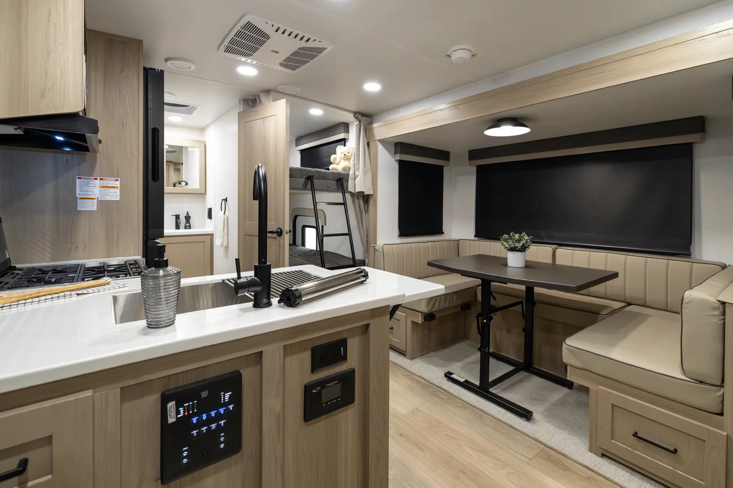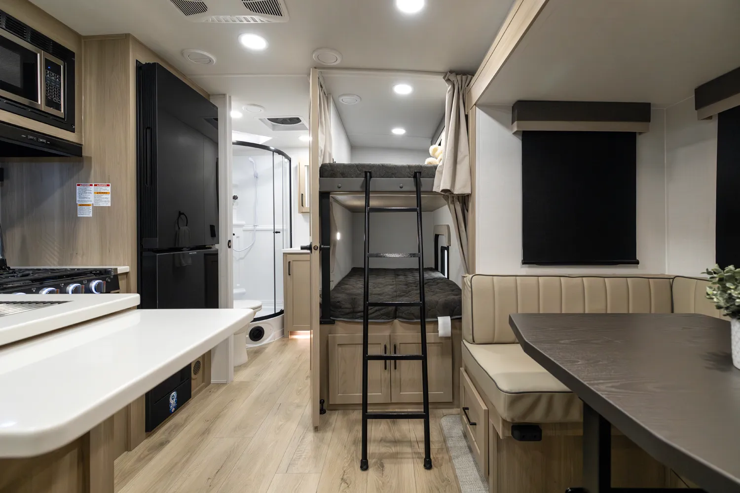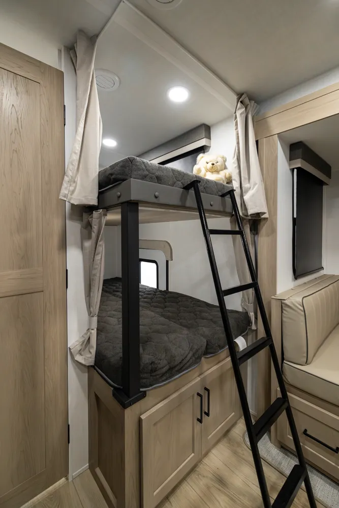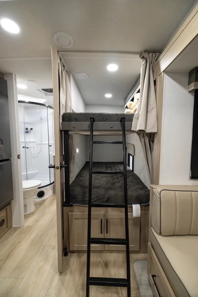 The 2520BH is a bunkhouse layout featuring a segregated front bedroom with a true queen bed and dual wardrobe closets for plenty of personal storage. In the main living area, you'll find a large U-shaped dinette, a spacious kitchen and two 36" x 71" bunks- perfect for kids or guests. This layout blends privacy, comfort, and roominess. An ideal setup for families and groups seeking versatile space on the road.