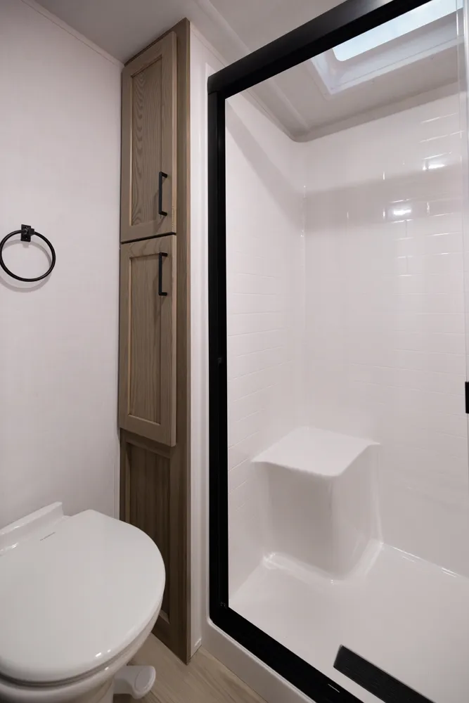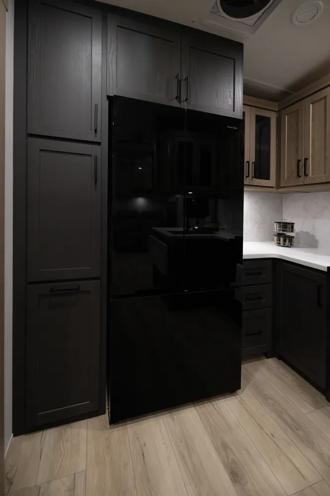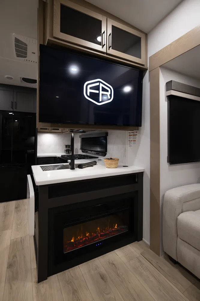 One of the best entertainment centers in the industry! This 371RK 5th wheel will entertain your family and friends for a night of relaxation after a long day of camping. It features a 68" Hide-a-Bed, a 60" Hide-a-Bed & 60" theater seating. Its front bedroom features a queen bed, (optional King) massive wardrobe storage & Washer/Dryer prep. The rear kitchen offers tons of counterspace paired with ample cabinet space, drawers, pantry storage & a trash can drawer.