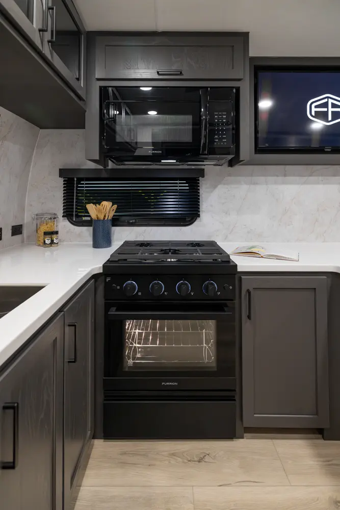 EXQUISITE, EXPANSIVE INTERIORS AS THE NORM. WELCOME TO THE SIGNATURE SERIES, REDEFINING THE CAMPING EXPERIENCE THROUGH AN ARRAY OF REMARKABLE FEATURES. With its inviting open floorplans and ample storage capacity, there's room for those cherished guests or family you wish to bring along. As you nestle into the embrace of a plush king or queen sized bed, the restlessness of your adventures fade away. Through its efficient layout and panoramic windows, the Signature travel trailers offer you an opportunity to luxuriate in your surroundings, all while enjoying the comfort of your serene interior.