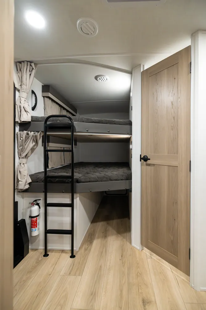 The 2706BH is a versatile, family friendly floorplan featuring a front bedroom with a true queen bed and a large rear bathroom with a shower. The living area and kitchen include comfortable seating and a dinette for meals and relaxation, while the segregated rear bunk room provides privacy and extra sleeping space, making the 2706BH perfect for families seeking comfort and functionality at the campsite.
