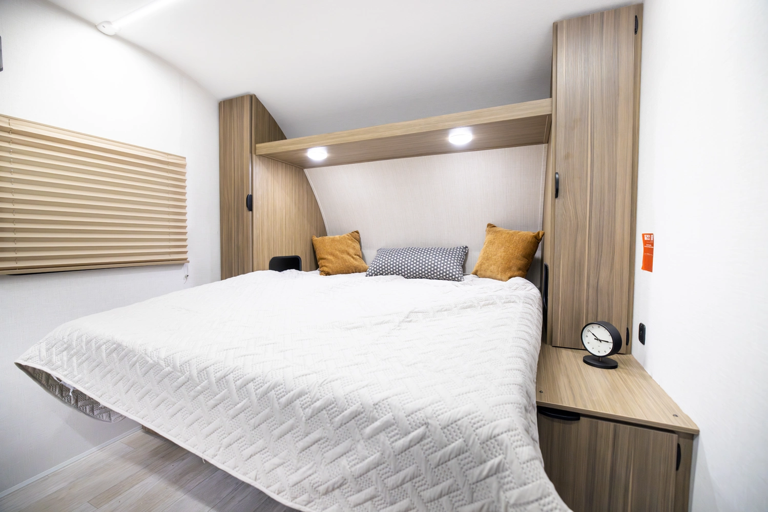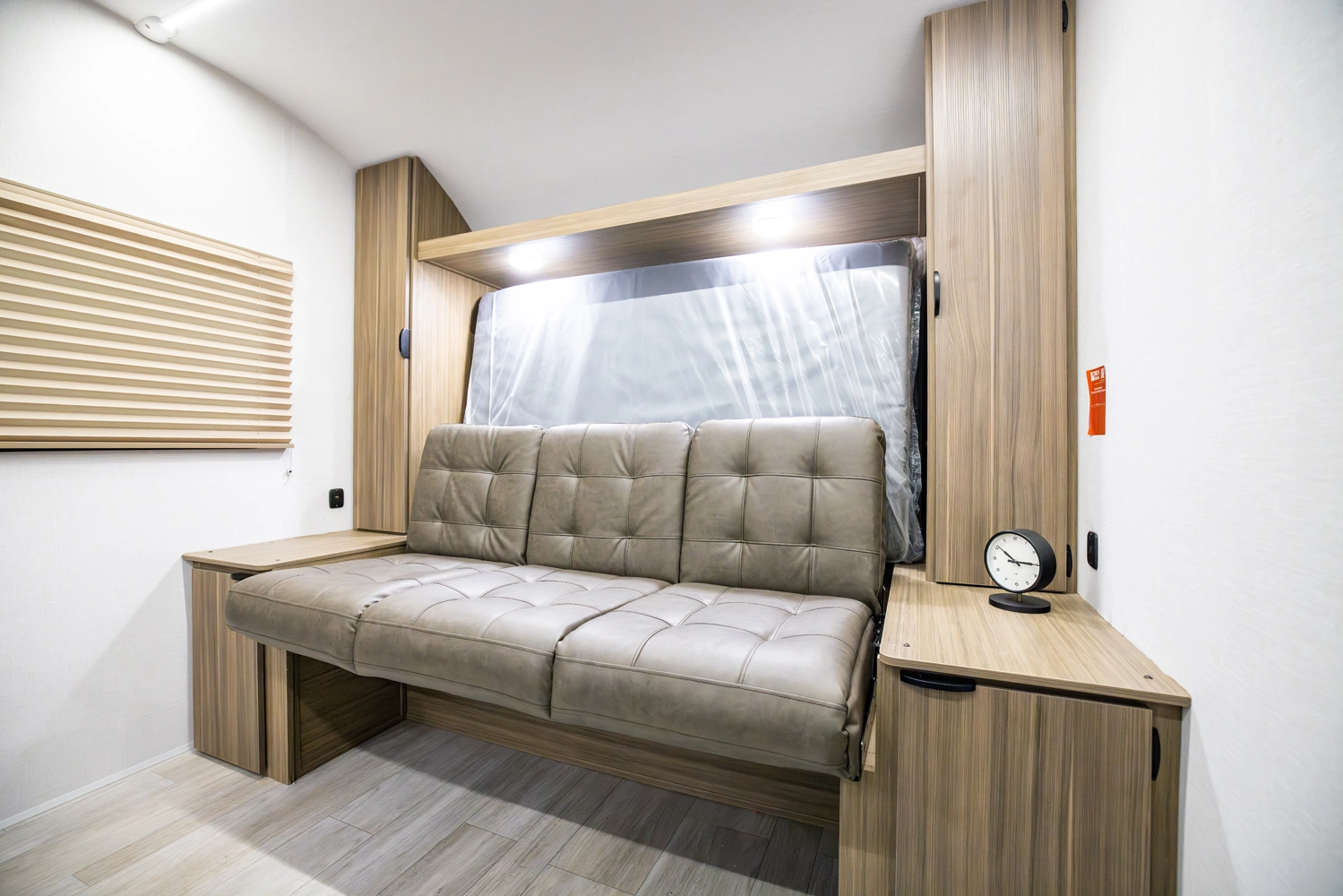 The 167RBK is just over 3,000 lb. of compact, yet feature-packed fun! The queen bed in front flips up to provide sofa space during the day, with end tables for extra storage and convenience. The booth dinette and large window give you great breakfast views, while the large rear bathroom provides a bit more elbow room than you'd expect—plus a bonus linen cabinet!