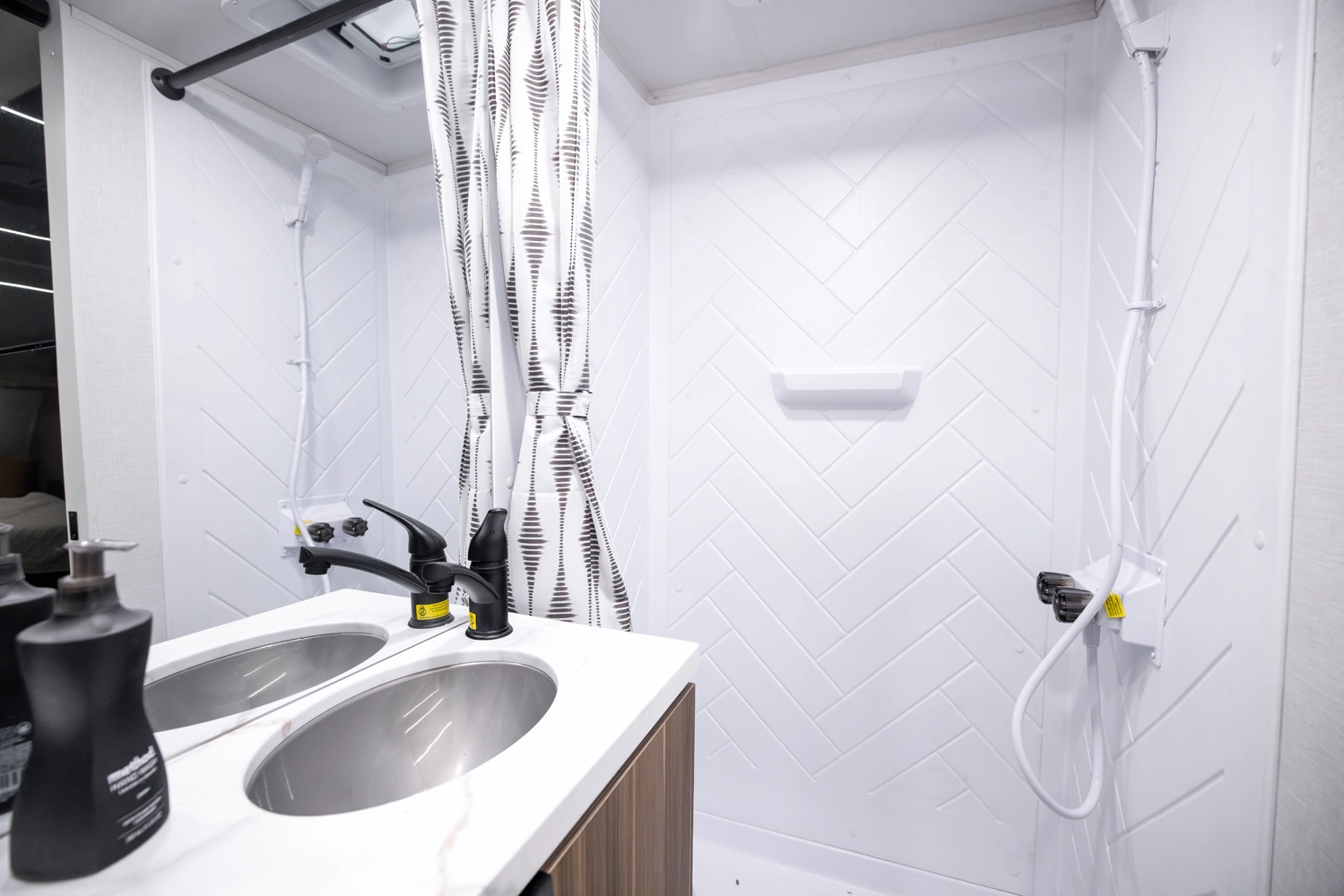 • Large 36x24 Shower Pan w/ Shower Surround + Waterproof Retractable Shower Door (No Curtain)