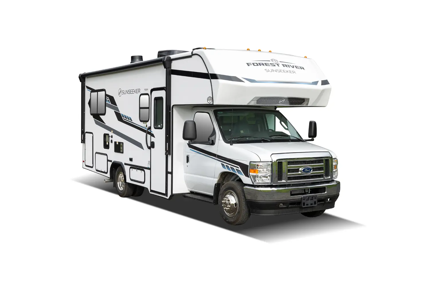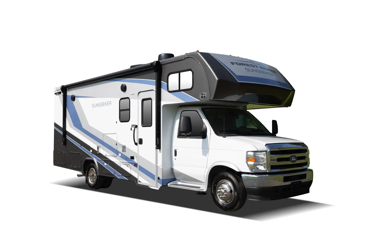 Sunseeker (Ford Chassis): An American classic for the open road. These options feature an upgraded EZRYDE suspension system for an exceptionally smooth ride, plus standard highlights like full-body paint options, slide toppers, and leather driver/passenger seats.