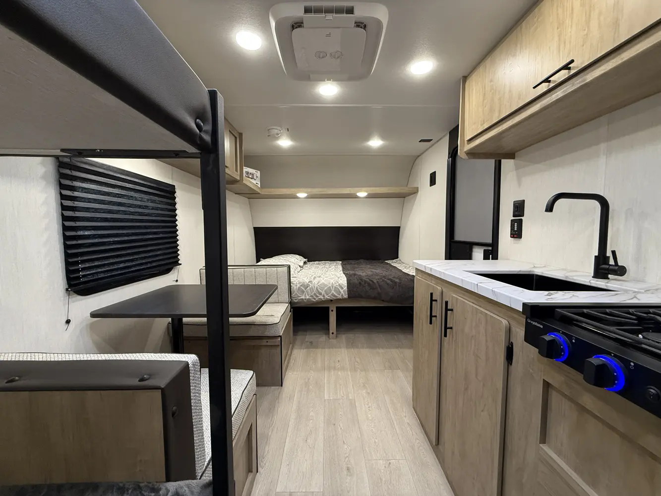 • Cherokee Black Label Wolf Pup (Deep Tinted Frameless Automotive Glass Windows, High Gloss Gel Coat Exterior Sidewalls, Multicolor Reading Lights, Pillowtop Mattress Upgrade, Power Tongue Jack, Pull Out Sprayer Faucet, Solid Surface Countertops, Thermo Foil Arctic Insulation)
